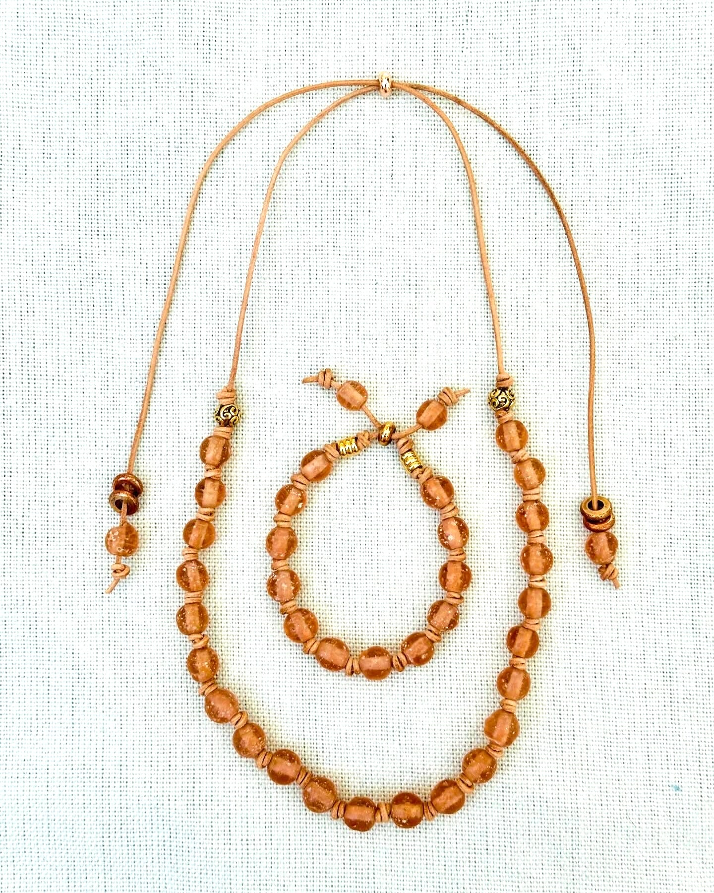 Ancient Rose Glass Beaded Necklace strung on natural leather with decorative gold-plated white metal finishing beads.