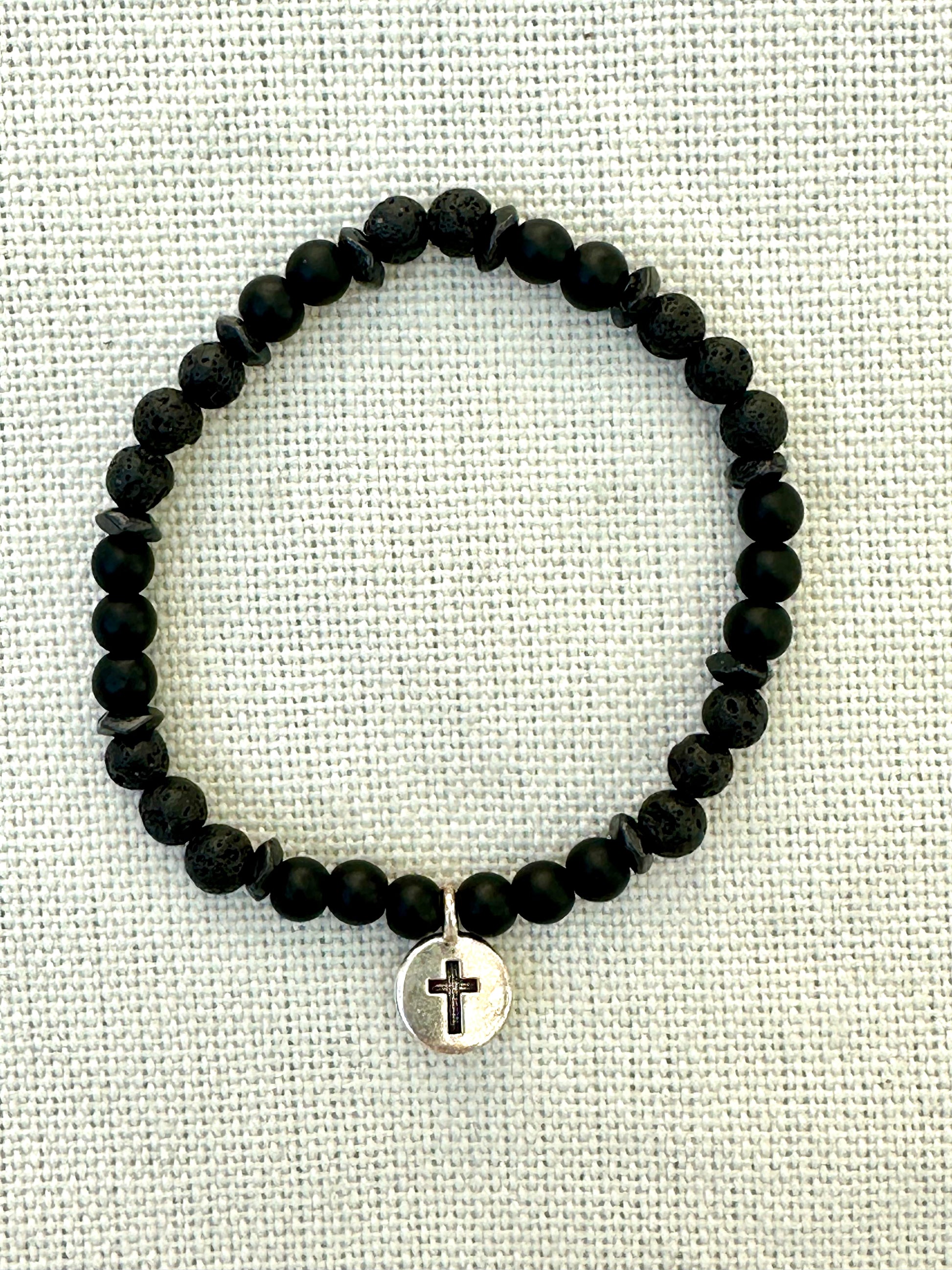 Black Glass and Lava Rock beaded Bracelet with Silver Toned Cross Charm