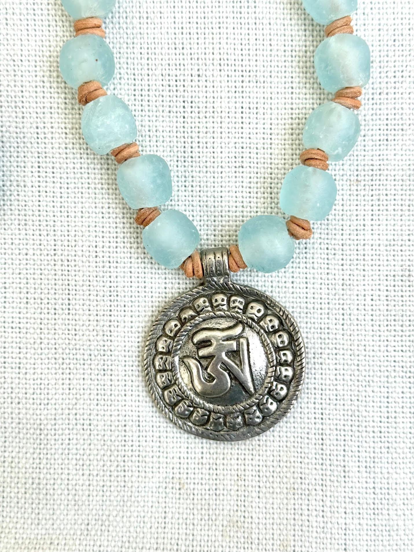 Blue Glass Beaded Necklace with round OM pendant strung on natural leather with chunky, silver-plated white metal finishing and ends beads.