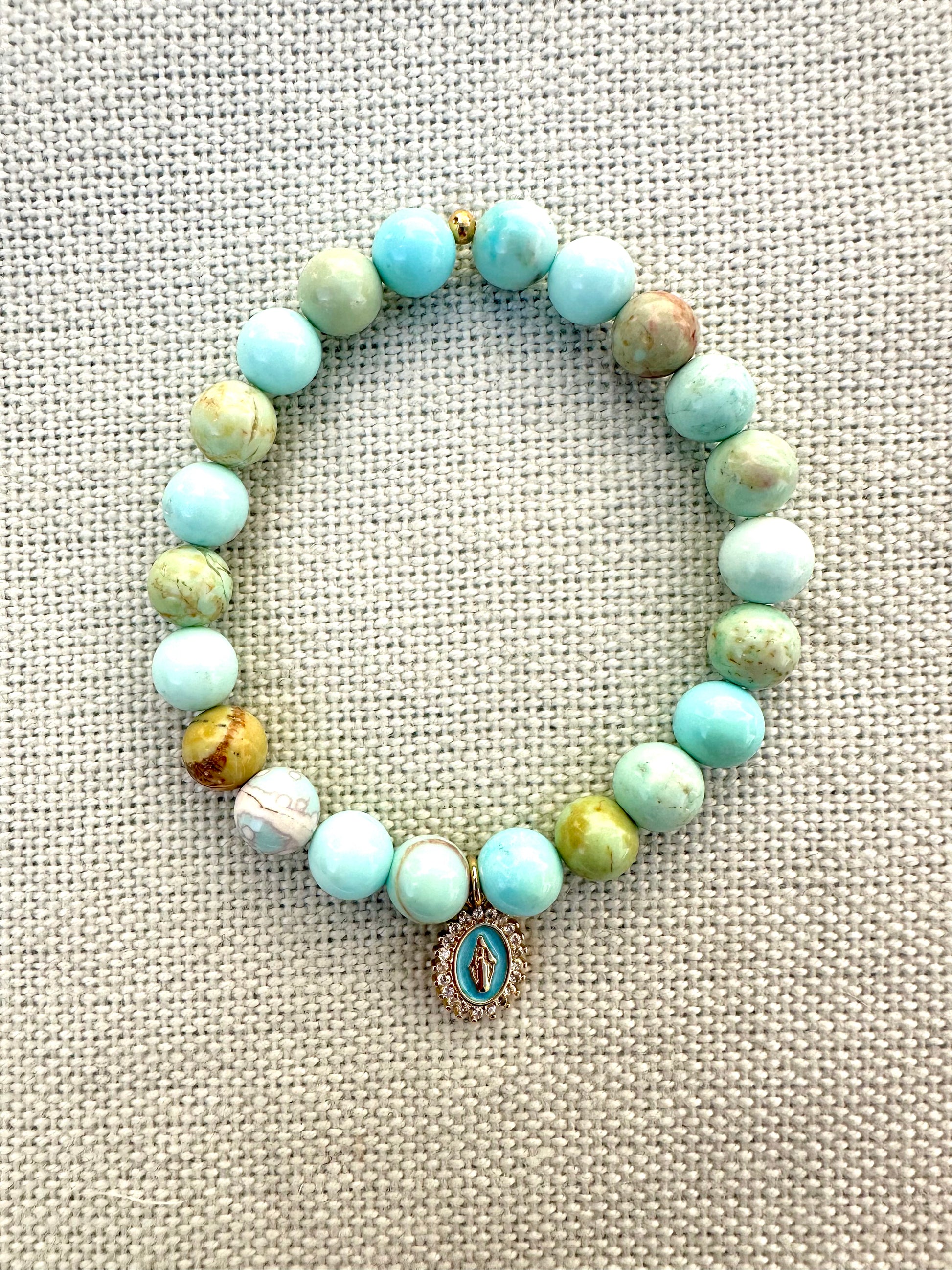 Blue swirl beach bracelet adorned with delicate blue enamel Virgin Mary Charm