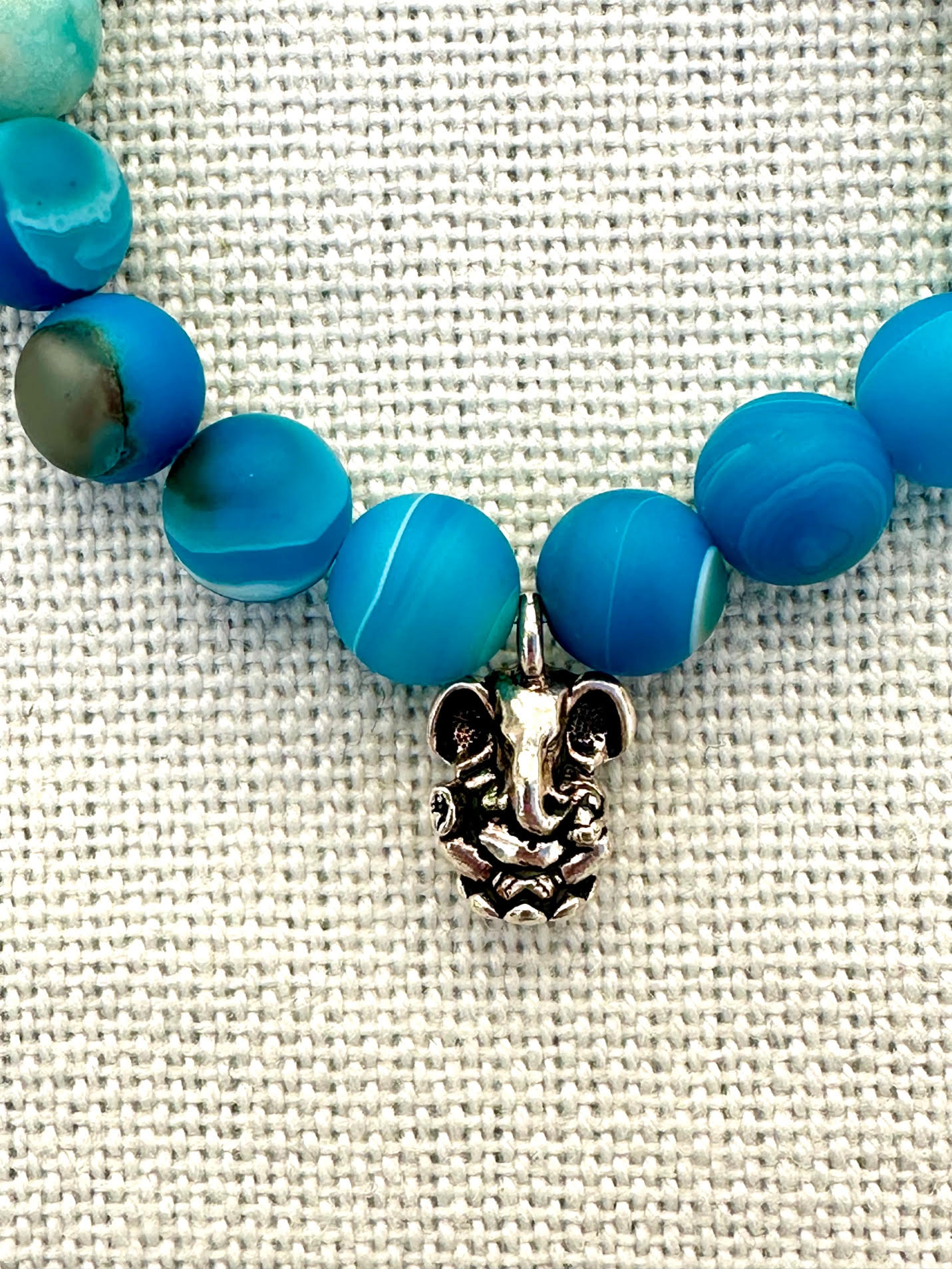 Bright Hawaiian Blue Variegated Agate Natural Stone 10mm Bracelet. Handcrafted with intention, this exquisite piece features vibrant blue stones that evoke tranquility. At the heart of this bracelet is a meticulously designed silver-toned Ganesh charm, symbolizing wisdom, new beginnings and removal of obstacles. Created to promote mindfulness and harmony in your daily life.