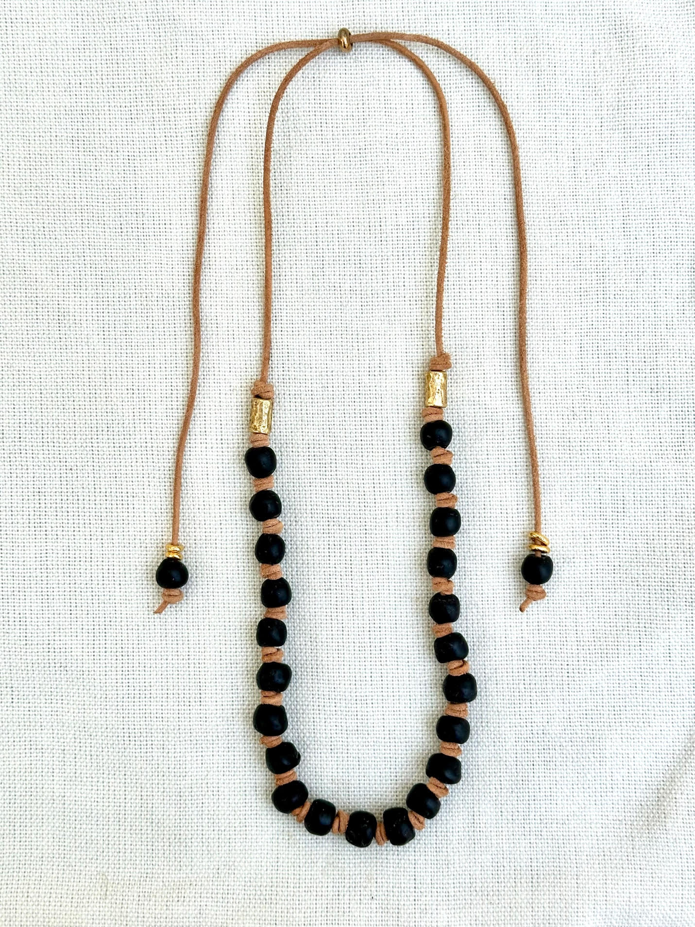 This versatile piece features opaque black beads, beautifully handcrafted from recycled glass, strung on all-natural leather for a unique and eco-friendly touch. Accented with elongated, gold-plated white metal finishing beads, this necklace exudes elegance and sustainability.