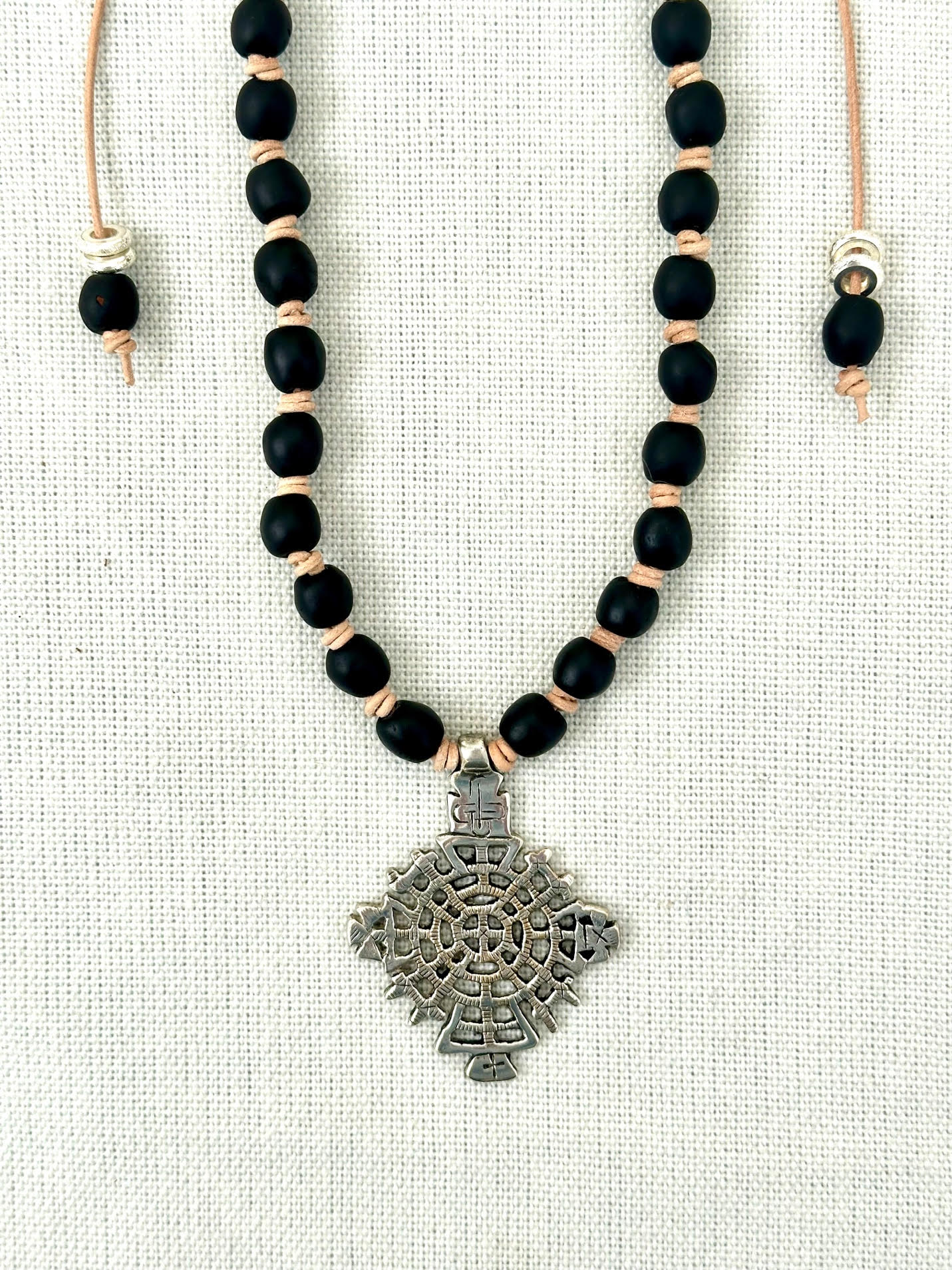 Opaque Black Glass Beaded Necklace with Ethiopian Silver Cross Pendant