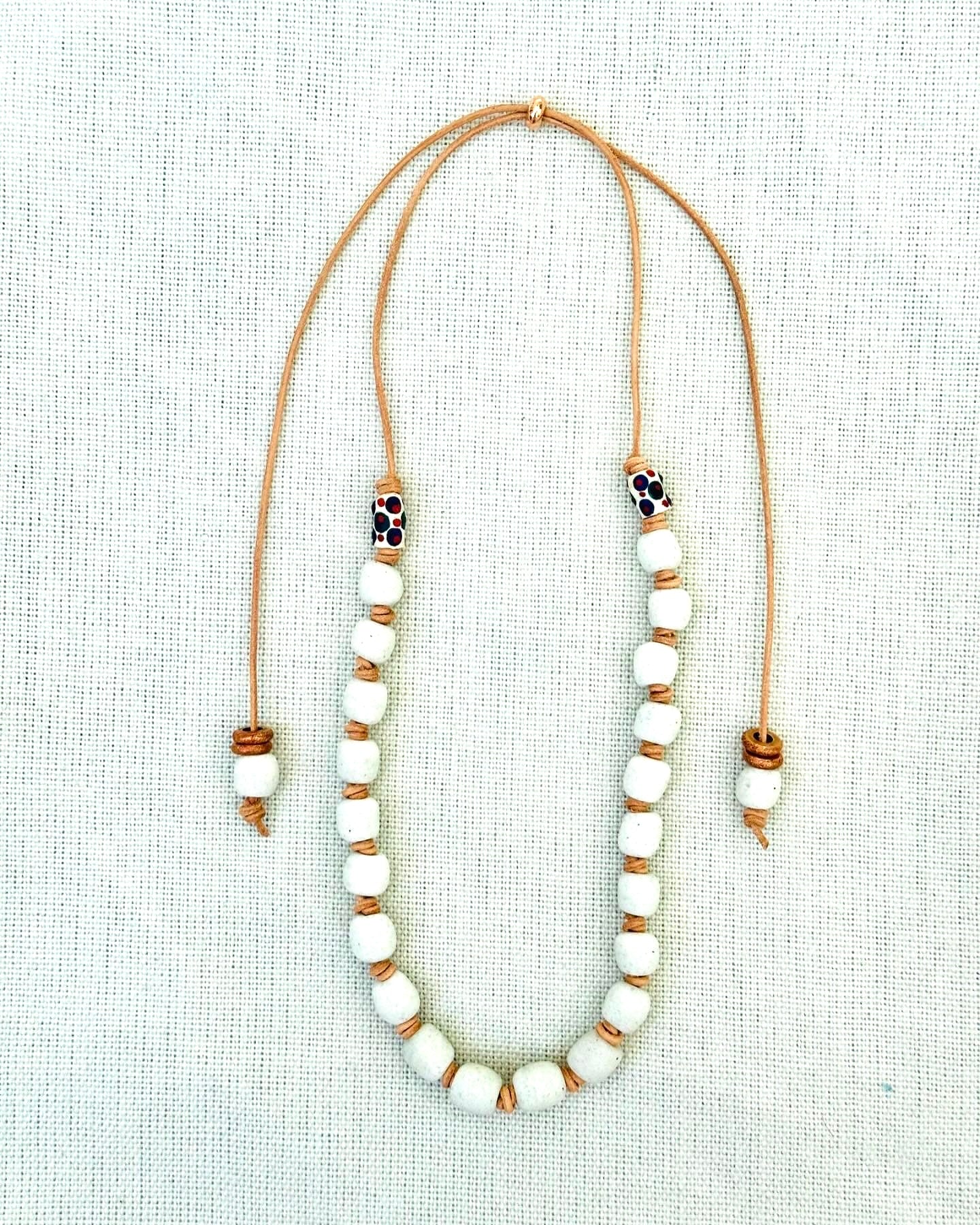 Opaque White Glass Beaded Necklace strung on natural leather with colorful hand painted ceramic finishing beads.