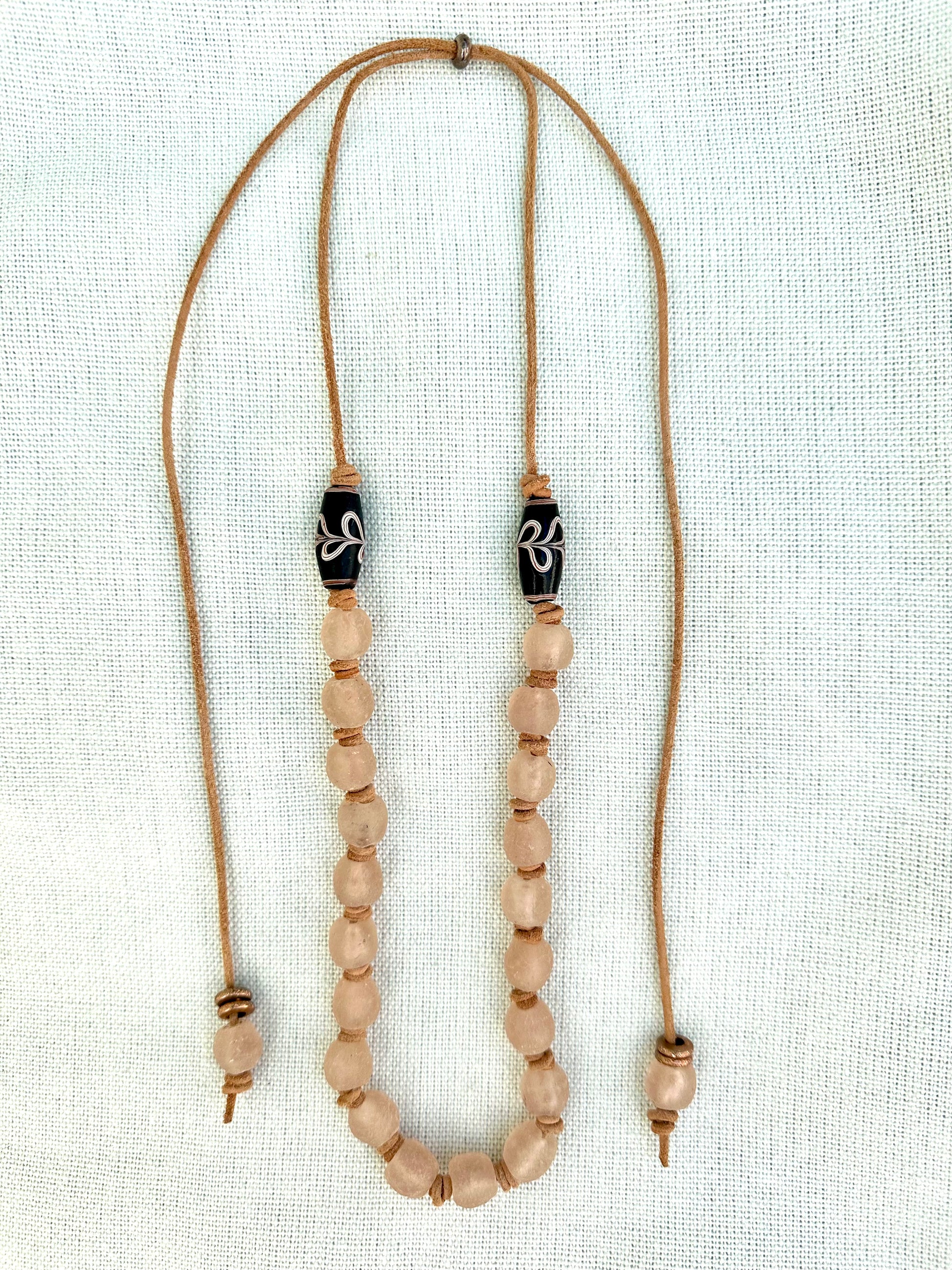 Rose Glass Beaded Necklace strung on natural leather with black and rose decorative wood finishing beads.