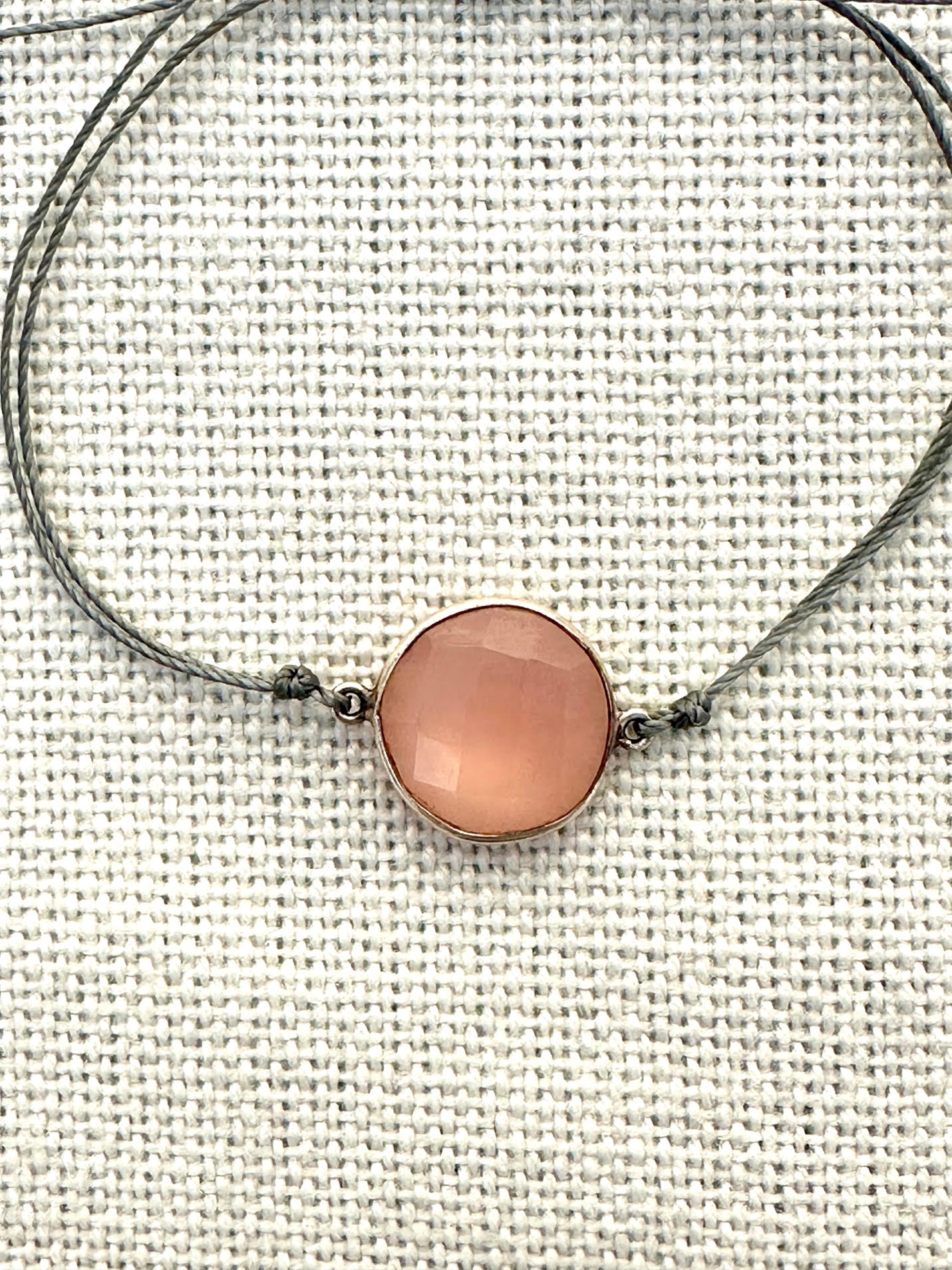 Introducing our exquisite Rose Quartz Precious Stone Bracelet, a perfect blend of elegance and mindful harmony. This simple, delicate piece features a genuine rose quartz stone, renowned for its soothing and loving energies. It measures approximately 14mm and is encased in sterling silver, carefully strung on grey fibrous string.