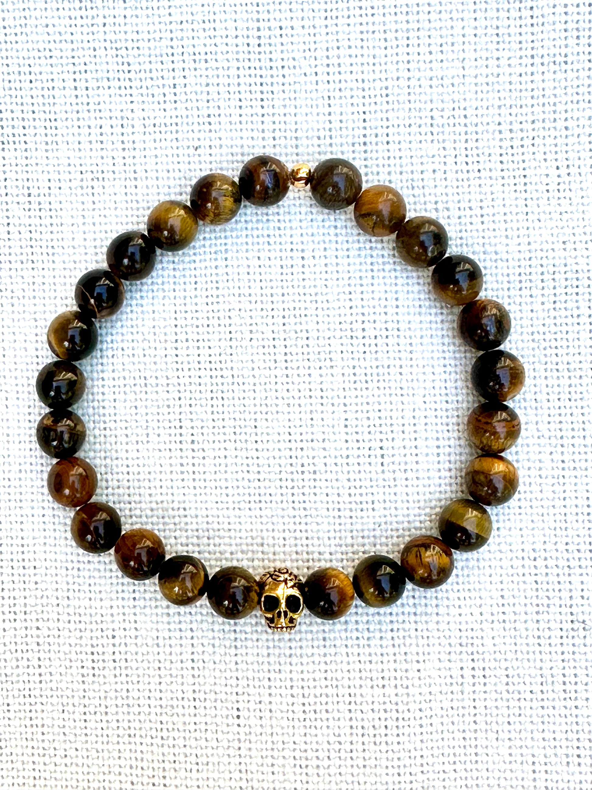 Elevate your style with this striking tiger eye bracelet, featuring a bold gold-toned skull charm. The tiger eye beads, known for their protective and grounding qualities, shimmer with rich shades of brown and gold, adding a touch of natural elegance to your wrist. The skull charm adds an edgy, yet sophisticated contrast, symbolizing strength and resilience. Perfect for those who appreciate a balance of earthy elements and modern flair, this bracelet is not just an accessory—it's a statement. Wear it on its own or stack it with others for a look that’s uniquely yours.
