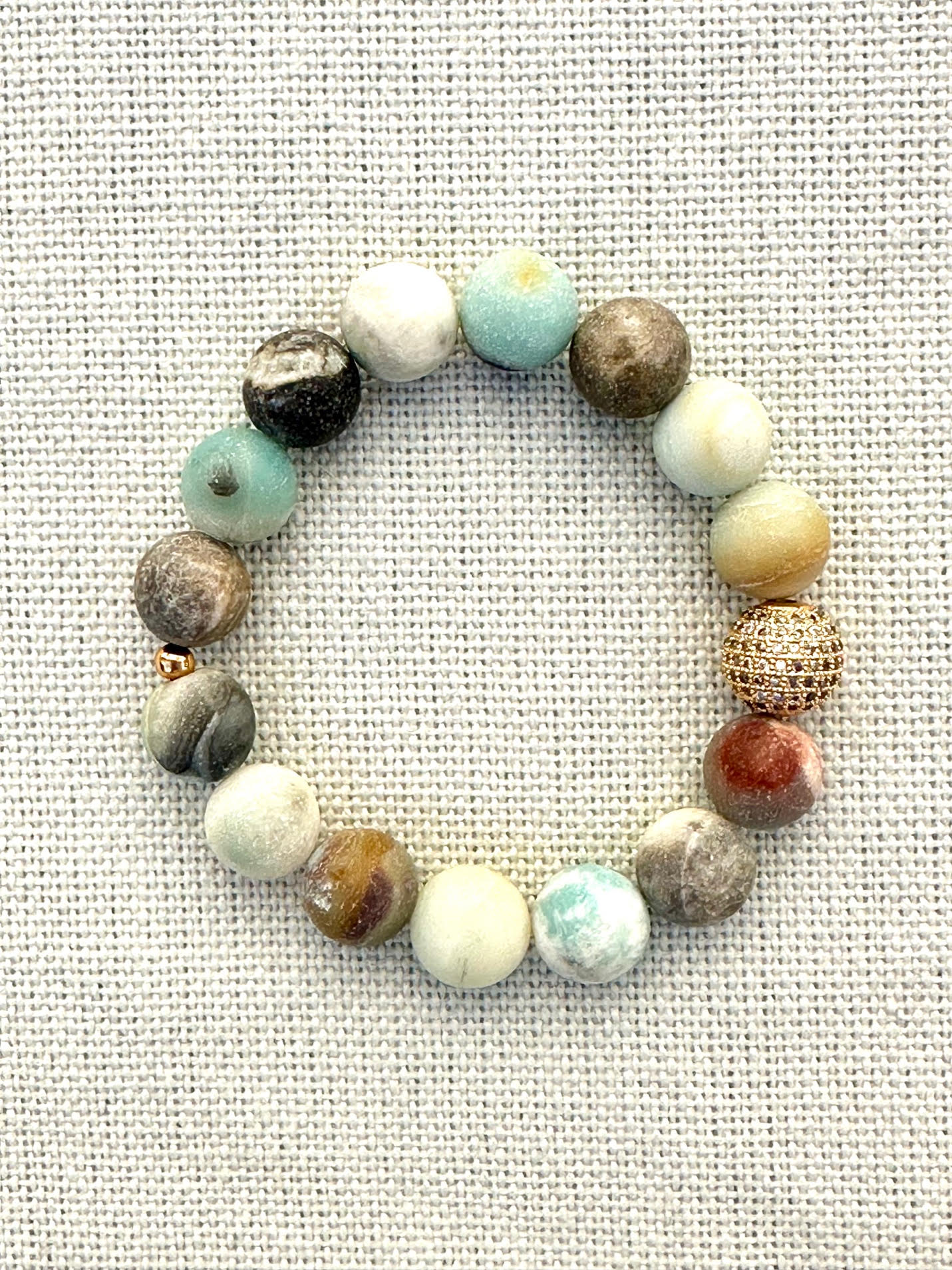 Elevate your style with this exquisite women's bracelet, crafted from natural Amazonite 12mm beads. This stunning piece showcases the harmonious blend of variegated earth and blue tones, evoking a sense of serenity and connection to nature.