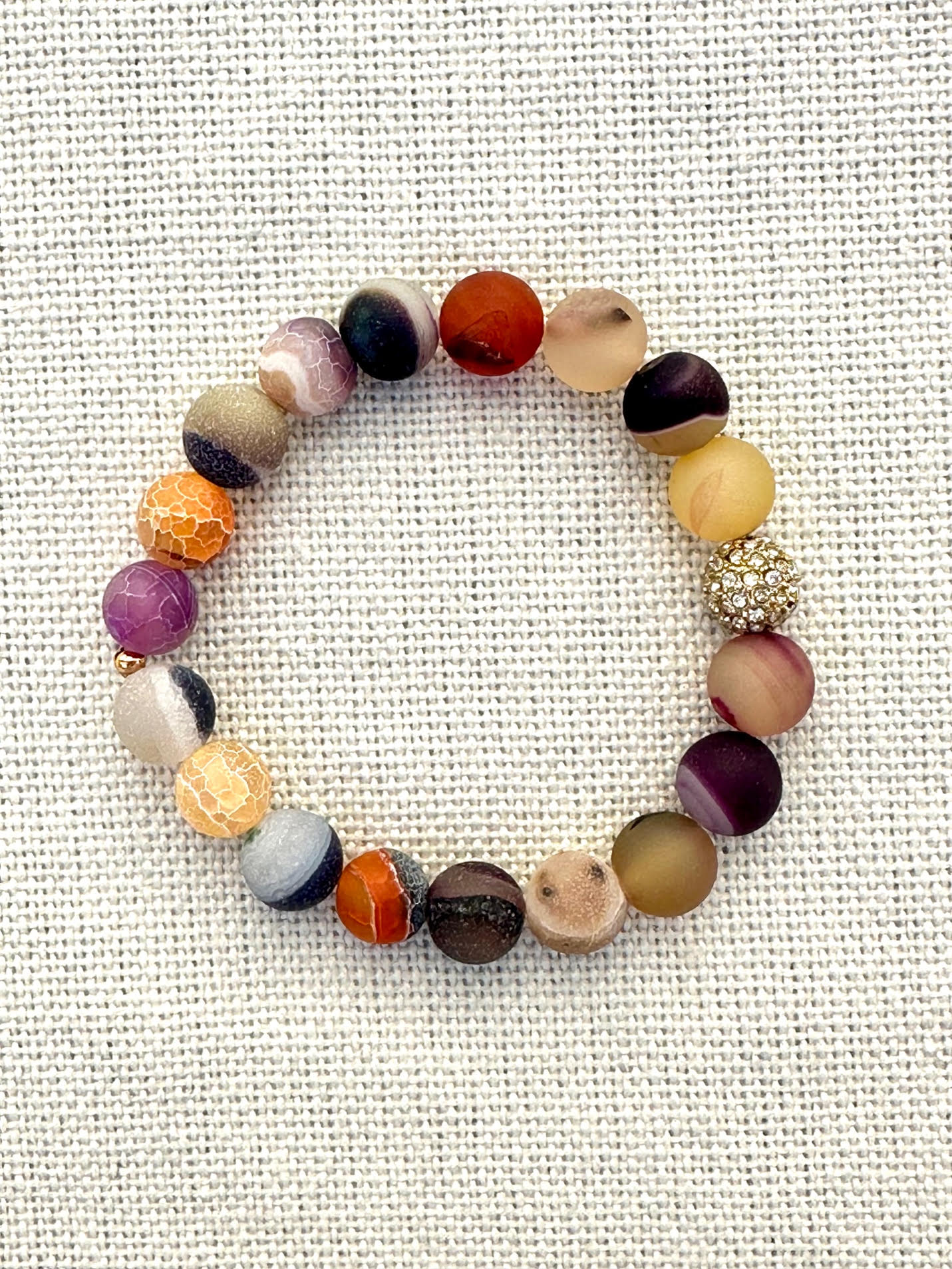 This vibrant swirl of multi-colored beads makes this bracelet exude a very “happy vibe” and is crafted from natural 10mm Amazonite beads. The round, 10mm gold-colored cubic zirconia bead, adds a touch of sparkle and is sure to make you smile when you wear it.